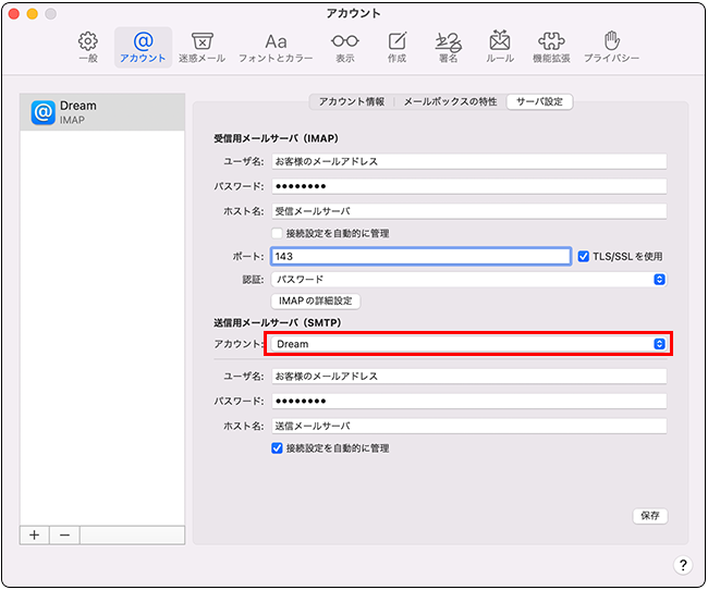 メールアドレス お客様のメールアドレス ユーザ名 お客様のメールアドレス パスワード お客様のメールパスワード アカウントの種類 IMAP 受信用メールサーバ 受信用メールサーバ 送信用メールサーバ 送信用メールサーバ DTIのメールサーバでは、SSL(暗号化)にも対応しております。