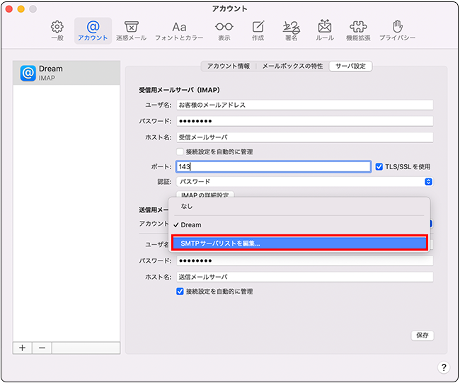ポート 143 TLS/SSLを使用 チェックを外します 認証 パスワード -