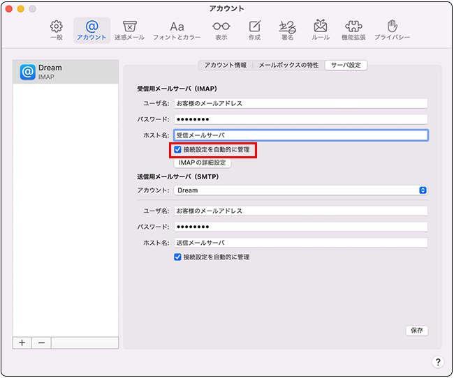 9 受信用メールサーバ(IMAP)の「接続設定を自動的に管理」のチェックを外します。