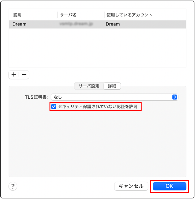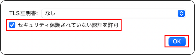10 「セキュリティ保護されていない認証を許可」にチェックを入れ、「OK」をクリックします。