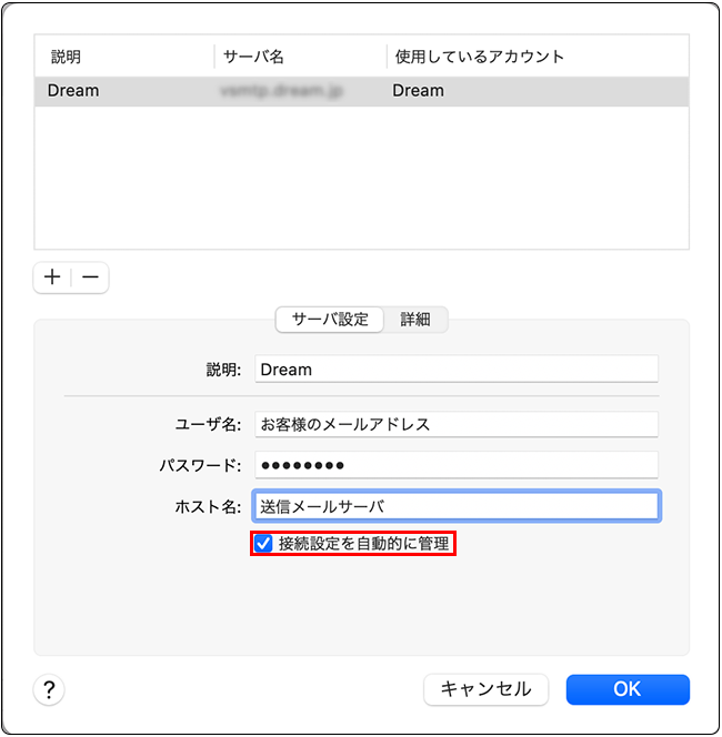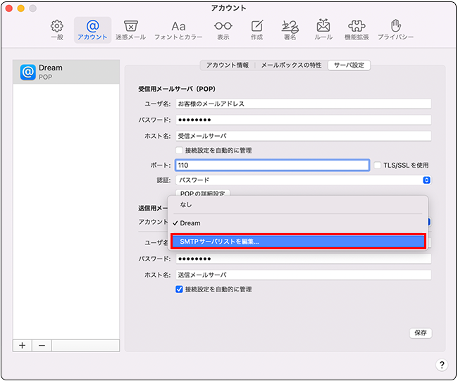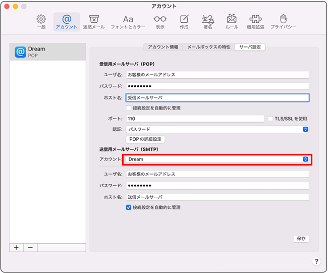 メールアドレス お客様のメールアドレス ユーザ名 お客様のメールアドレス パスワード お客様のメールパスワード アカウントの種類 POP 受信用メールサーバ 受信用メールサーバ 送信用メールサーバ 送信用メールサーバ DTIのメールサーバでは、SSL(暗号化)にも対応しております。
