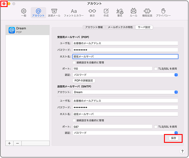 16 「保存」をクリックした後、画面左上の「●」で画面を閉じて設定を終了します。