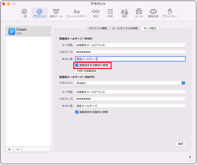 8 受信用メールサーバ(POP)の「接続設定を自動的に管理」のチェックを外します。