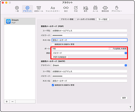 ポート 110 TLS/SSLを使用 チェックを外します 認証 パスワード -