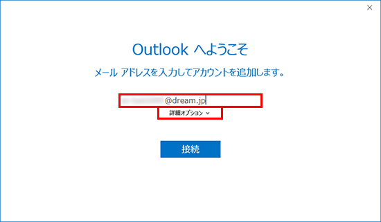 3 「Outlook へようこそ」画面がでるのでメールアドレスを入力し、「詳細オプション」をクリックします。