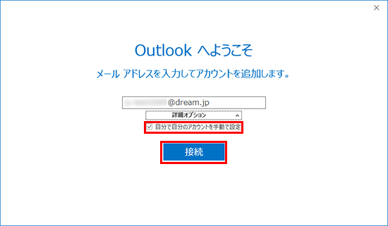4 「自分で自分のアカウントを手動で設定」にチェックを入れ、「接続」をクリックします。