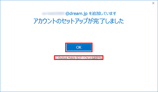 10 「アカウントのセットアップが完了しました」の画面が表示されますので、「Outlook Mobile をスマートフォンにも設定する」のチェックを外して「OK」をクリックします。