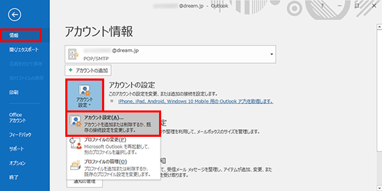 12 「情報」の「アカウント設定」をクリックし、「アカウント設定(A)…」をクリックします。