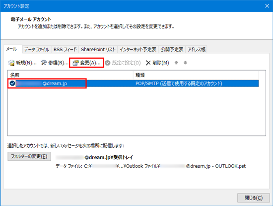 13 「アカウント設定」画面が表示されますので、アカウントを選択し、「変更」をクリックします。