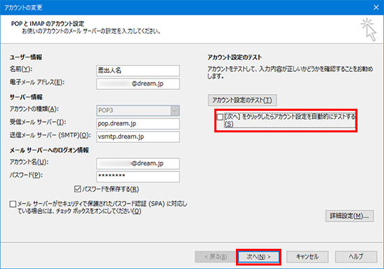 15 「[次へ]をクリックしたらアカウント設定を自動的にテストする」のチェックを外して「次へ」をクリックします。