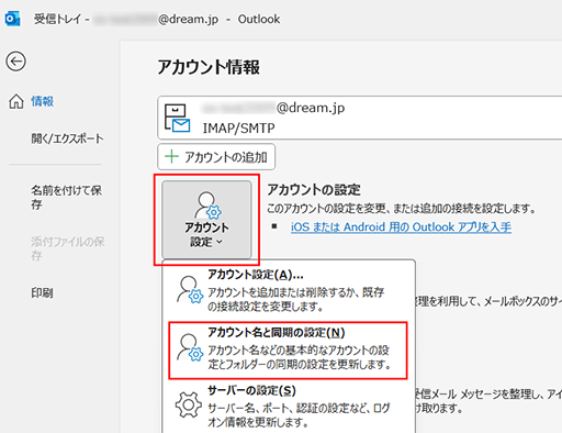 9 【アカウント設定】→【アカウント名と同期の設定(N)】の順にクリックします。