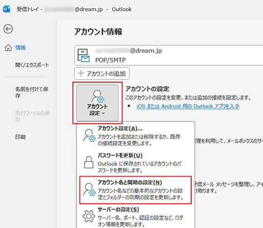 9 【アカウント設定】→【アカウント名と同期の設定(N)】の順にクリックします。