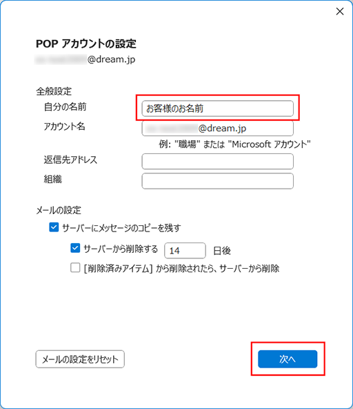 10 自分の名前欄に、メール送信時に相手に通知したい差出人としてのお名前を入力し、【次へ】をクリックします。