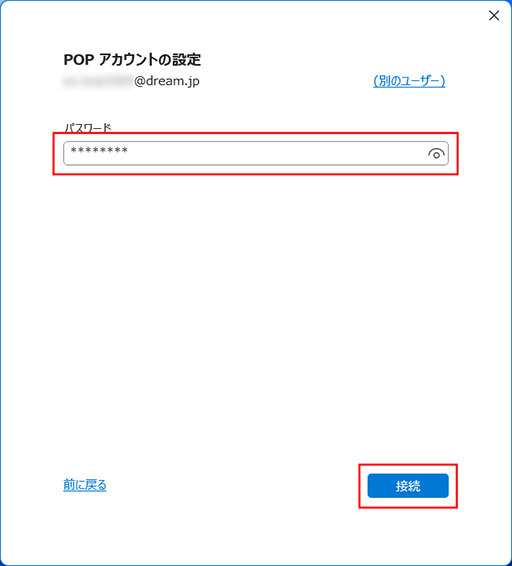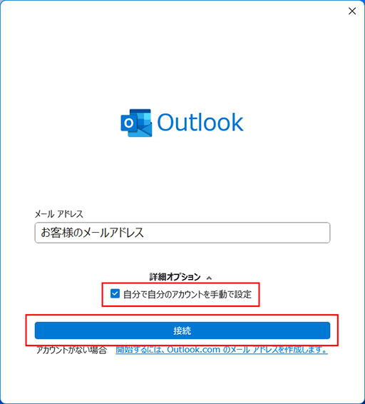 3 【自分で自分のアカウントを手動で設定】にチェックを入れ、【接続】をクリックします。