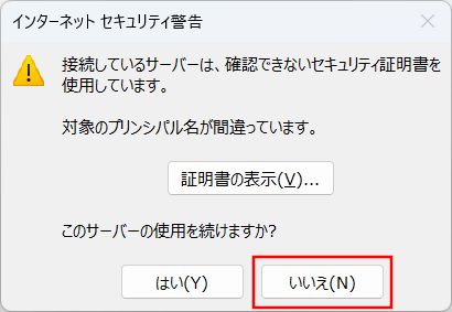 例)smtp.b-star.net など465 - ⑥の画面が表示されずに、インターネットセキュリティ警告の画面が表示された場合