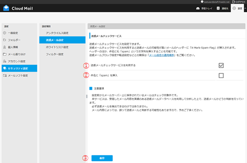 迷惑メールチェックサービスはCloud Mailログイン後に設定できます。